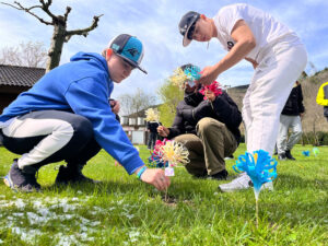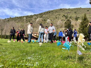 En el campamento de Ezcaray creamos un campo de flores hecho por jóvenes. Cada flor era diferente porque además llevaba un recuerdo especial de la persona que la hizo. Plantamos todas las flores en un prado para que nos pudiéramos llevar una flor y un bonito recuerdo sabiendo que siempre que tengamos un mal día, lo podemos mirar y recrear ese momento especial.