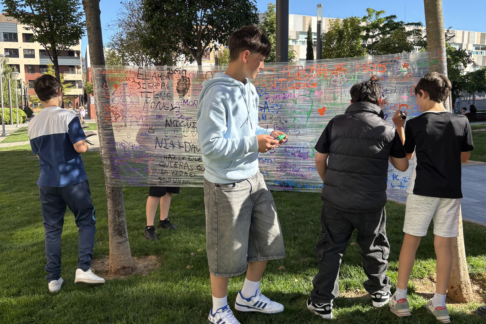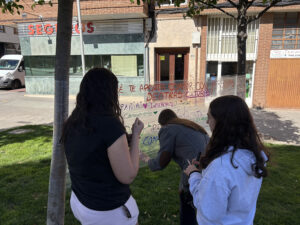 Entre las 17:00h y las 18:30h, nos instalamos con el grupo motor de j贸venes en un espacio p煤blico de Arnedo, donde desarrollamos una acci贸n colectiva: la creaci贸n de un mural art铆stico sobre una “pared ficticia” hecha con papel film, en el que personas transe煤ntes fueron invitadas a dejar su huella respondiendo a la pregunta: